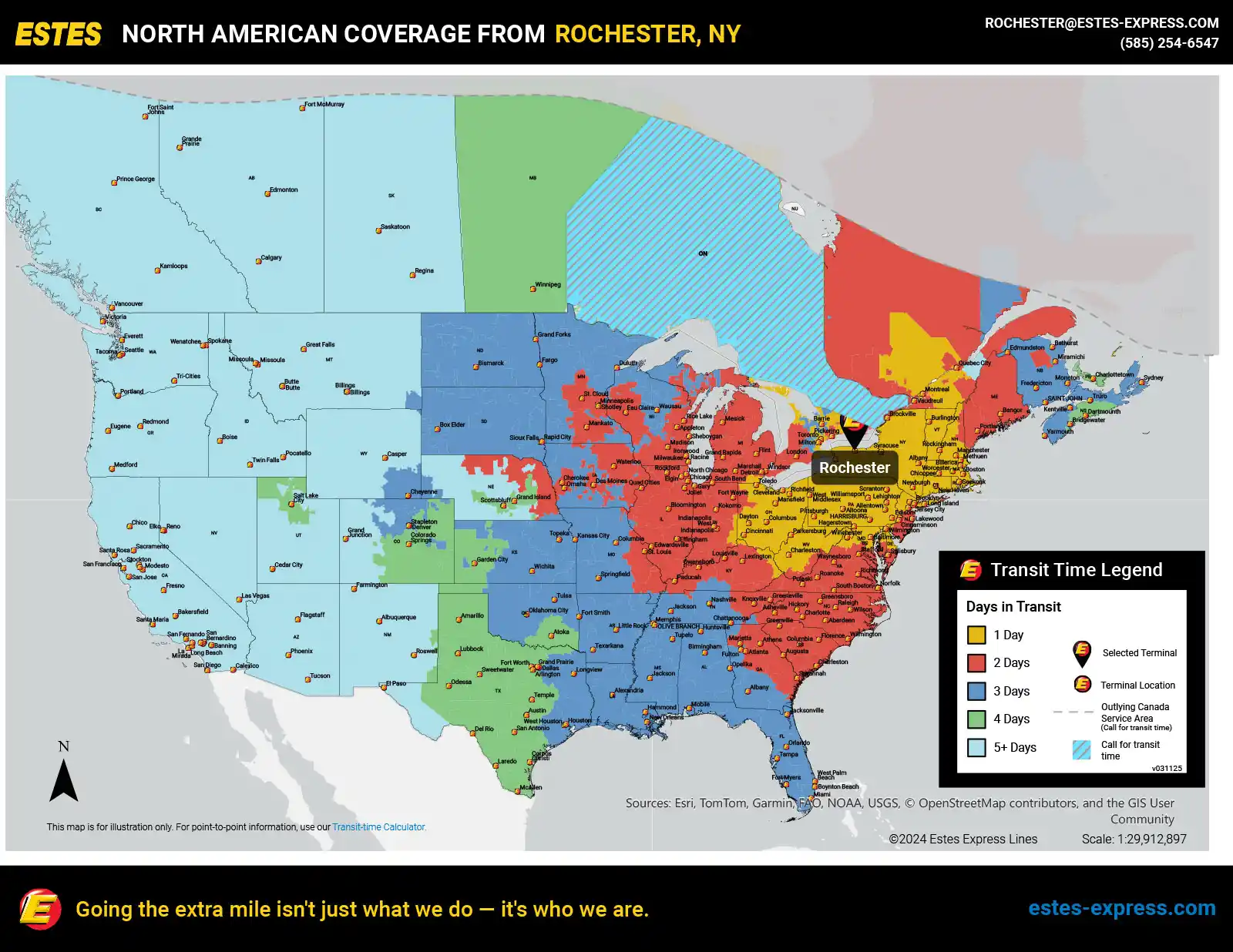 Estes offers next-day LTL freight shipping from the Rochester area to NYC, Philadelphia, Toronto, Montreal, Boston, Cincinnati, Cleveland, Columbus, Pittsburgh, Buffalo, Baltimore, New Haven, Syracuse, Albany—and more.