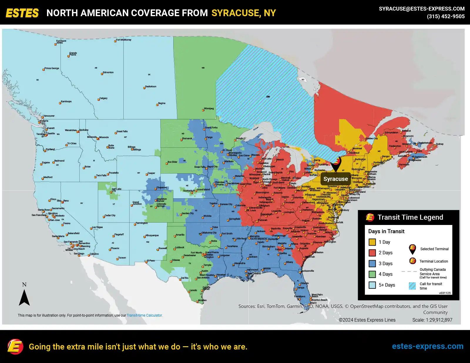 Estes offers next-day LTL shipping from Syracuse to NYC, Philadelphia, Toronto, Montreal, DC, Boston, Baltimore, Pittsburgh, Cleveland, Buffalo, New Haven, Norfolk, Richmond, Albany, Rochester—and more.